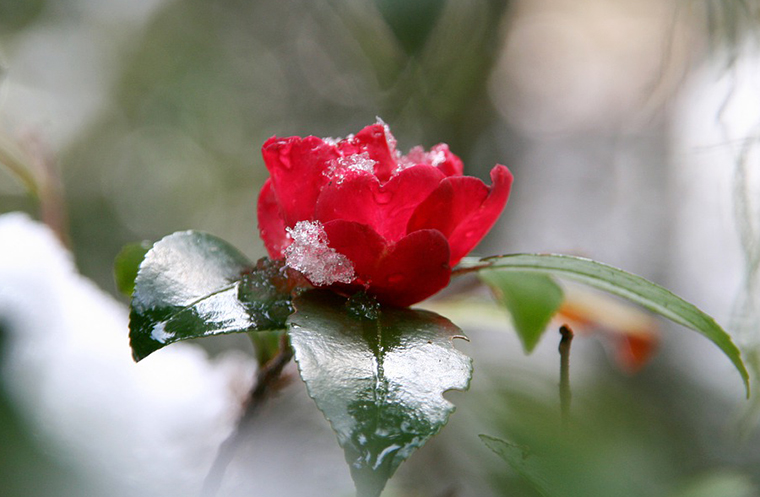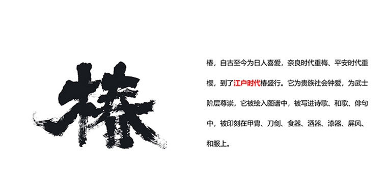“椿花”是日本對山茶花的稱呼,花期一般是在冬至春季。椿花的花色秀麗脫俗,香氣清新怡人,人聞到后有精神爽朗的感覺。在日本,椿花與櫻花齊名,被譽為“圣花”。奈良時代重梅、平安時代重櫻,到了江戶時代椿盛行。“椿”為貴族社會鐘愛,為武士階層尊崇,它被繪入圖譜中,被寫進詩歌、和歌、俳句中,被印刻在甲胄、刀劍、食器、酒器、漆器、屏風、和服上。