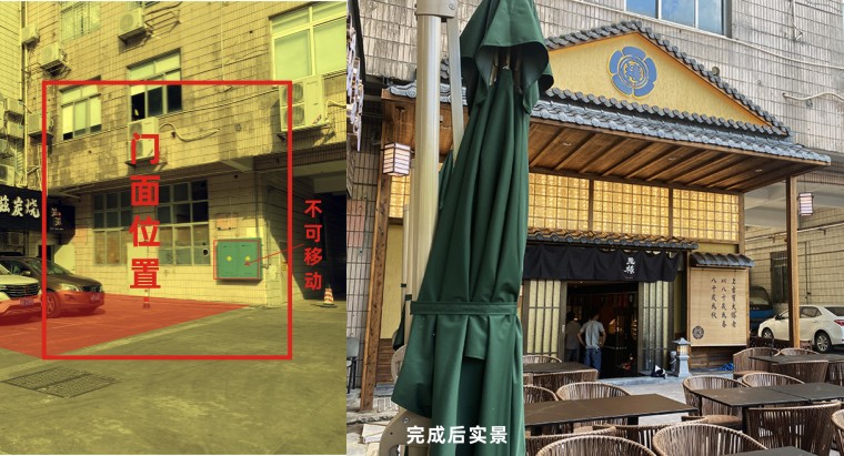玉椿燒鳥居酒屋首店位于深圳的餐飲網(wǎng)紅高地——車公廟十畝地正對面。門店之前是一家中餐的后廚的全部空間及部分包間,其中一半的面積屬于上一家餐廳自己搭建的二層。空間結(jié)構(gòu)非常復雜,地面高地不平,尤其是搭建部分的1層,2層實際高度不到2.5米,心理感受很逼窄,這個場地極為