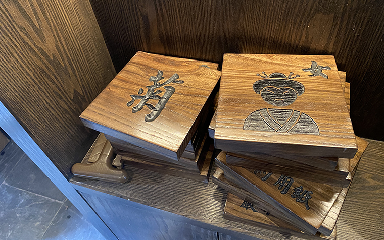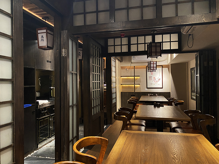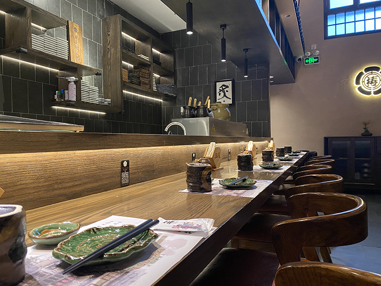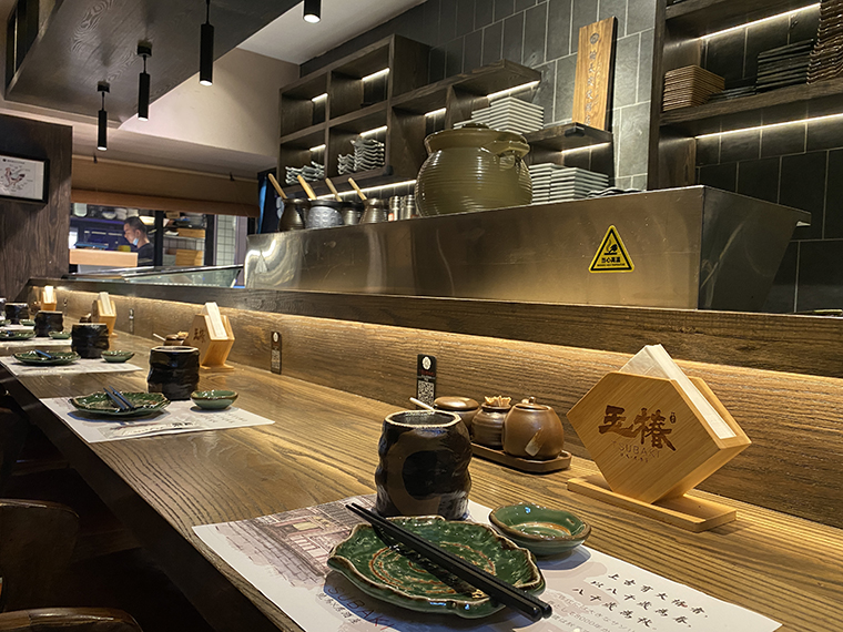 為了營造京都風格的空間感受,品深餐飲為玉椿設計定制的家具采用了實木材質(zhì),開放漆做舊工藝處理,呈現(xiàn)出一種江戶時代的歷史滄桑質(zhì)感;與門店的招牌匾額,儲存柜顏色完全一致,顧客使用時候的歷史