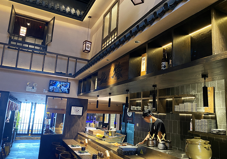 2、一樓大廳及吊頂?shù)脑O計:把京都的古老街道,巷子搬到我們店里。整個大廳的頂部環(huán)繞一圈日式黑瓦頂,四周幾個日式玻璃木窗,與地面的青石瓦面,墻體的稻草漆,燒烤吧臺形成一體化的京都風格。置身其中,仿佛