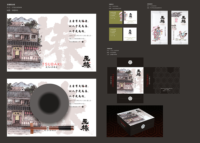 我們希望透過這個書法文字的LOGO標識及輔助的家徽圖案塑造玉椿經(jīng)典的日式美學氣質(zhì)和料理文化底蘊。表達品牌傳承百年,初心如一的愿景,使之成為指引玉椿品牌前進的燈塔。玉椿燒鳥居酒屋,將“