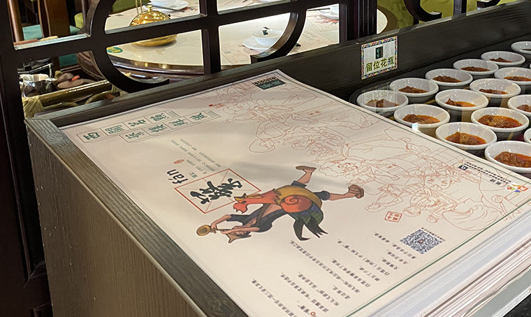 此次海報(bào)設(shè)計(jì)有六個(gè)連續(xù)畫面,正好適合推廣明星款產(chǎn)品。因蘩樓的產(chǎn)品本身就有較強(qiáng)的藝術(shù)美感及傳頌效果,綜合店長(zhǎng)及蘩樓主廚師建議,我們選取了6款產(chǎn)品來(lái)作為本次海報(bào)主題畫面,每一款海報(bào)主推一款明星產(chǎn)品,以連續(xù)陣列式畫面排開(kāi),顧客路過(guò)通過(guò)6個(gè)重復(fù)品牌畫面+強(qiáng)調(diào)明星產(chǎn)品的形式,視覺(jué)震撼,很容易形成對(duì)蘩樓的品牌記憶。