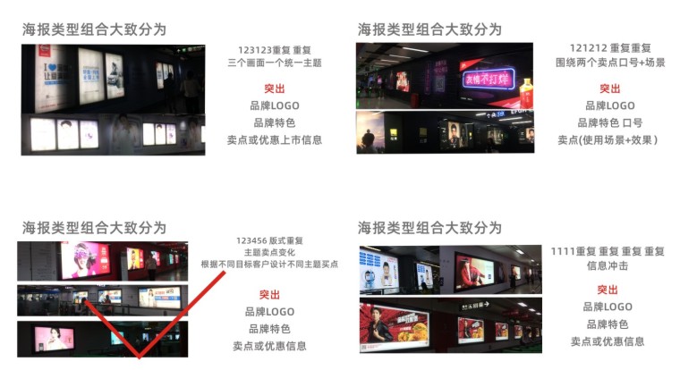 我們選取了(周末時(shí)間+上班時(shí)間)兩天,對(duì)深圳客流密集的多個(gè)地鐵中轉(zhuǎn)站點(diǎn),和幾個(gè)特定時(shí)間段。進(jìn)行現(xiàn)場(chǎng)蹲點(diǎn)觀察,并拍攝了目前1000多張地鐵站現(xiàn)存的海報(bào)圖片實(shí)例。通過(guò)對(duì)海報(bào)圖片的分類整理,地鐵站客流對(duì)廣告關(guān)注度點(diǎn)的觀察。最終團(tuán)隊(duì)投票選取出印象最深且能傳達(dá)品牌信息的多張地鐵站品牌海報(bào)進(jìn)行廣告?zhèn)鞑ピ砑霸O(shè)計(jì)原理逆向推理分析:
