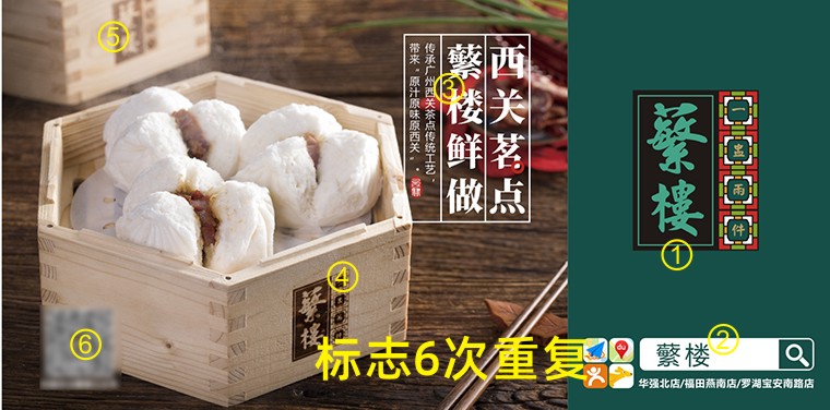 a 畫面重復(fù)三次以上出現(xiàn)“蘩樓”logo信息:由于顧客是路過(guò),而且離畫面很近,所以眼光掃射之處并不是全部看見(jiàn)海報(bào)的,而是海報(bào)的某一個(gè)角落或一個(gè)點(diǎn)一個(gè)面的形式組合。因此畫面中我們從廣告語(yǔ)“西關(guān)茗點(diǎn),蘩樓鮮做”+蘩樓logo+搜索框“蘩樓”+蒸籠上“蘩樓”,在一個(gè)畫面中多次刻意出現(xiàn)蘩樓品牌logo。