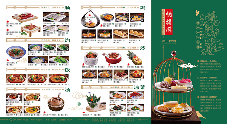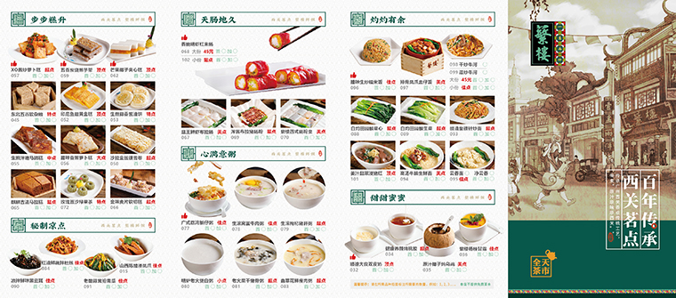 菜單價格避免使用常規排版版式,盡量弱化代替,將價格數字縮小,金錢標志¥20簡化為20.價格后面標明菜品的單位。價格代替,例如品深設計做的悅得閑、寶粵樓、蘩樓等廣式點心的菜單,都不放價格,用小點、大點、中點、特點、頂點、超點、精點、佳點、優點來代替。在底部統一將小點、大點、中點、特點、頂點、超點、精點、佳點、優點標上價格。菜品與價格隔離就會減少價格對顧客的影響,不經意間放大了顧客的消費金額。
