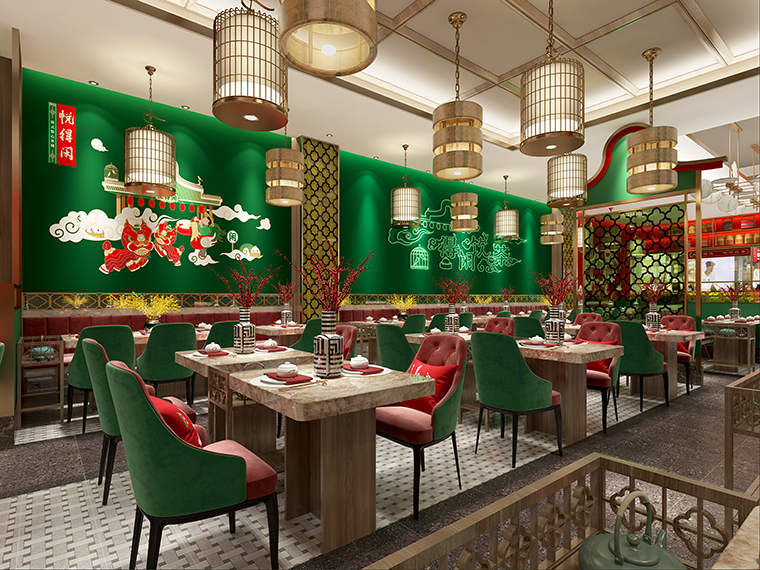 悅得閑廣式點心茶樓空間裝飾設計、茶樓軟裝設計、茶樓空間品牌植入、茶樓平面布局設計、廣式點心茶樓燈光設計。