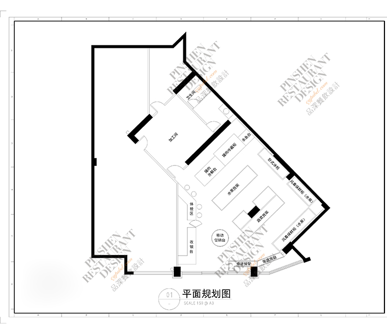 為了實現(xiàn)以上兩個目標,我們將功能進行合理的分區(qū),使空間實現(xiàn)了最大化利用;在裝飾設計方面則以主題深綠色,搭配使用淺灰色,形成一種簡潔素雅,明快整齊的空間格調(diào),并與其他生鮮品牌形成了明顯的區(qū)分;墻面及門框、臺面等,我們使用紋理較為細膩的木色,與空間淺灰色配合,形成一種時尚,高級的氛圍感。