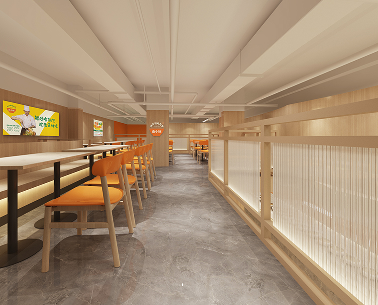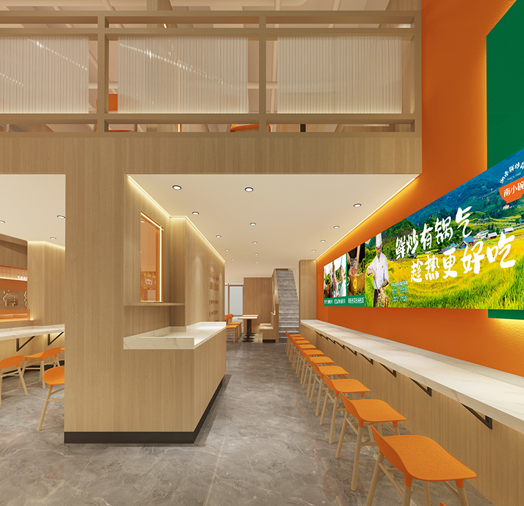 3、內部使用大面積的橙色體現鮮炒有鍋氣的特點,橙色既使人產生一種陽光熱情的心里感受,又是現炒時火焰的顏色,體現了現炒的特性,識別度非常高。整面墻的木色板材,木色有自己獨特的質感、在空間中又更有親和力,在狹窄的簡餐空間中也會讓人感受到輕松,給人一種可釋懷的愉悅,讓人隨時隨地都能感受到大自然的生機。