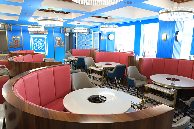 空間設計亮點:我們餐廳的整體氛圍應該輕奢且品質感很強;熱鬧卻不喧囂,精致有特色但容易讓人親近!整個餐廳的色彩以暖色調的不銹鋼金色為主,凸顯火鍋的用餐熱鬧,同時也讓顧客更容易親近,柜體運藍色表達出鮮明的港式風格,同時也點明我們海鮮火鍋的特色。