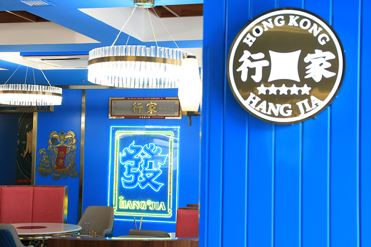 品牌記憶點:南派醒獅+香港海洋藍+玫瑰金不銹鋼+品牌元素在空間中應用